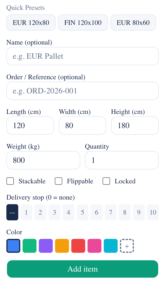 - Click Add item. Cargo appears in the 3D view instantly — the algorithm arranges items automatically.
