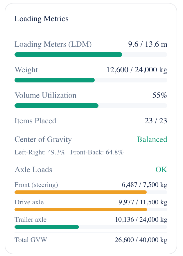 - Loading metrics (LDM, weight, volume utilization) with progress bars