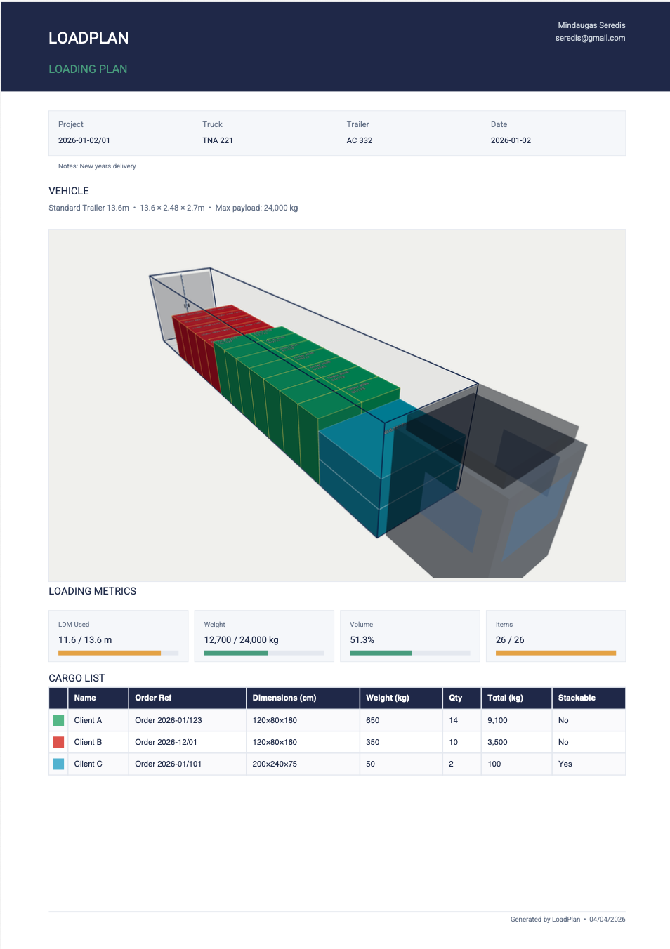 Example PDF: project info, 3D trailer view, loading metrics, and cargo table with color-coded items.
