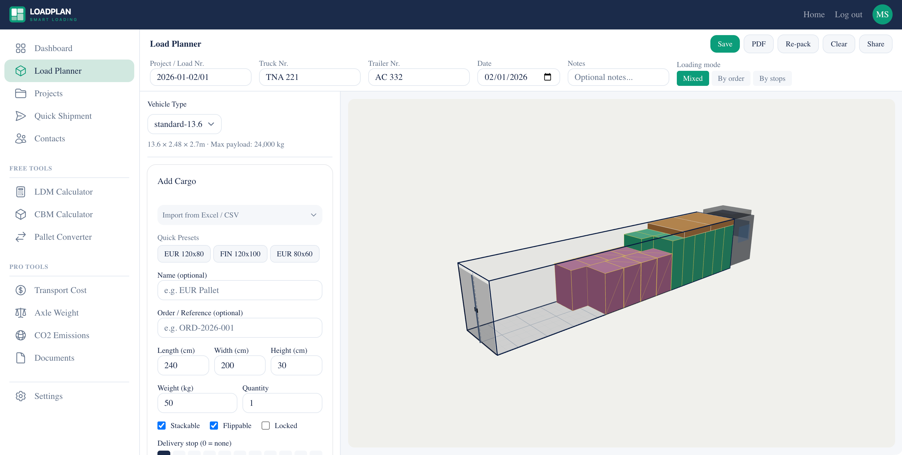 - Top bar: Project info (project number, truck/trailer numbers, date, notes), loading mode selector, and action buttons (Save, PDF, Re-pack, Clear, Share).