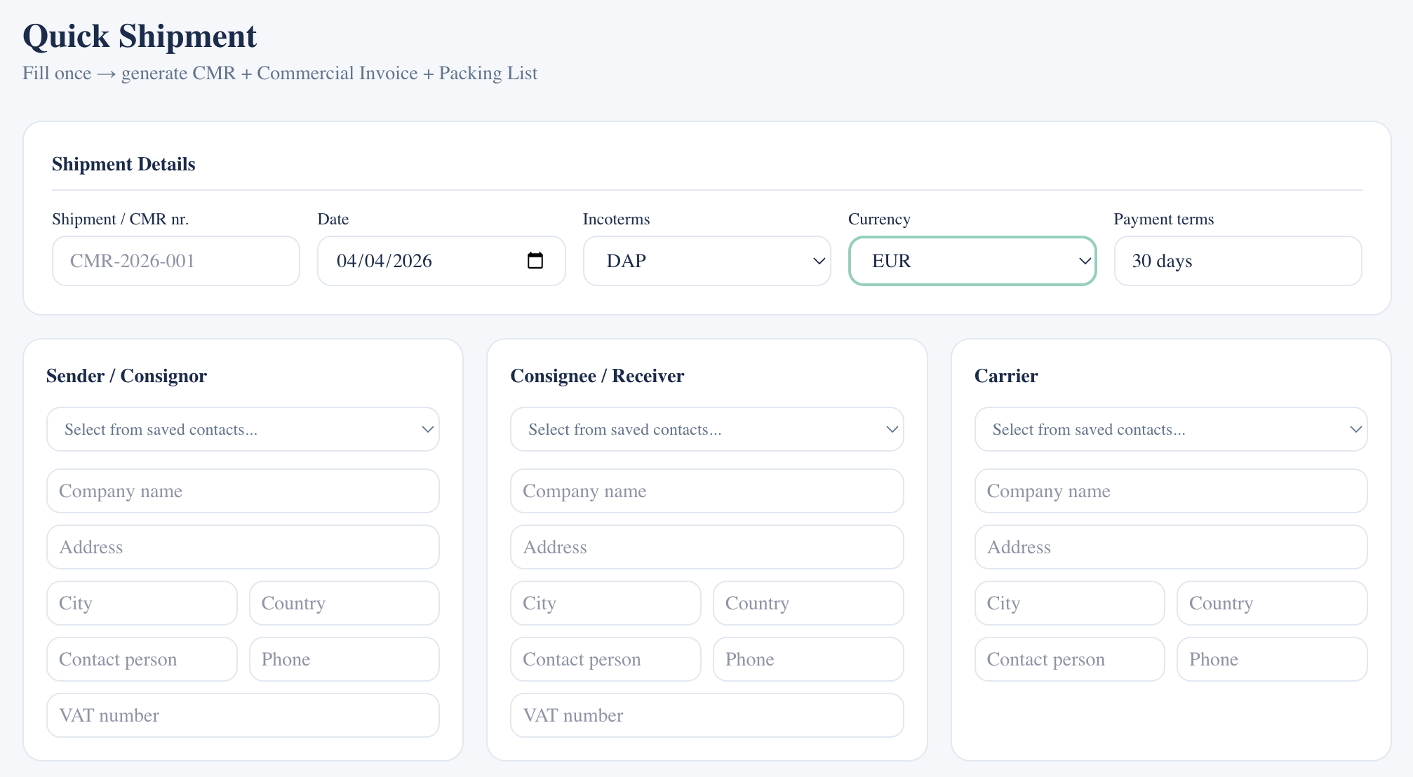 Quick Shipment: fill once, generate CMR + Commercial Invoice + Packing List.